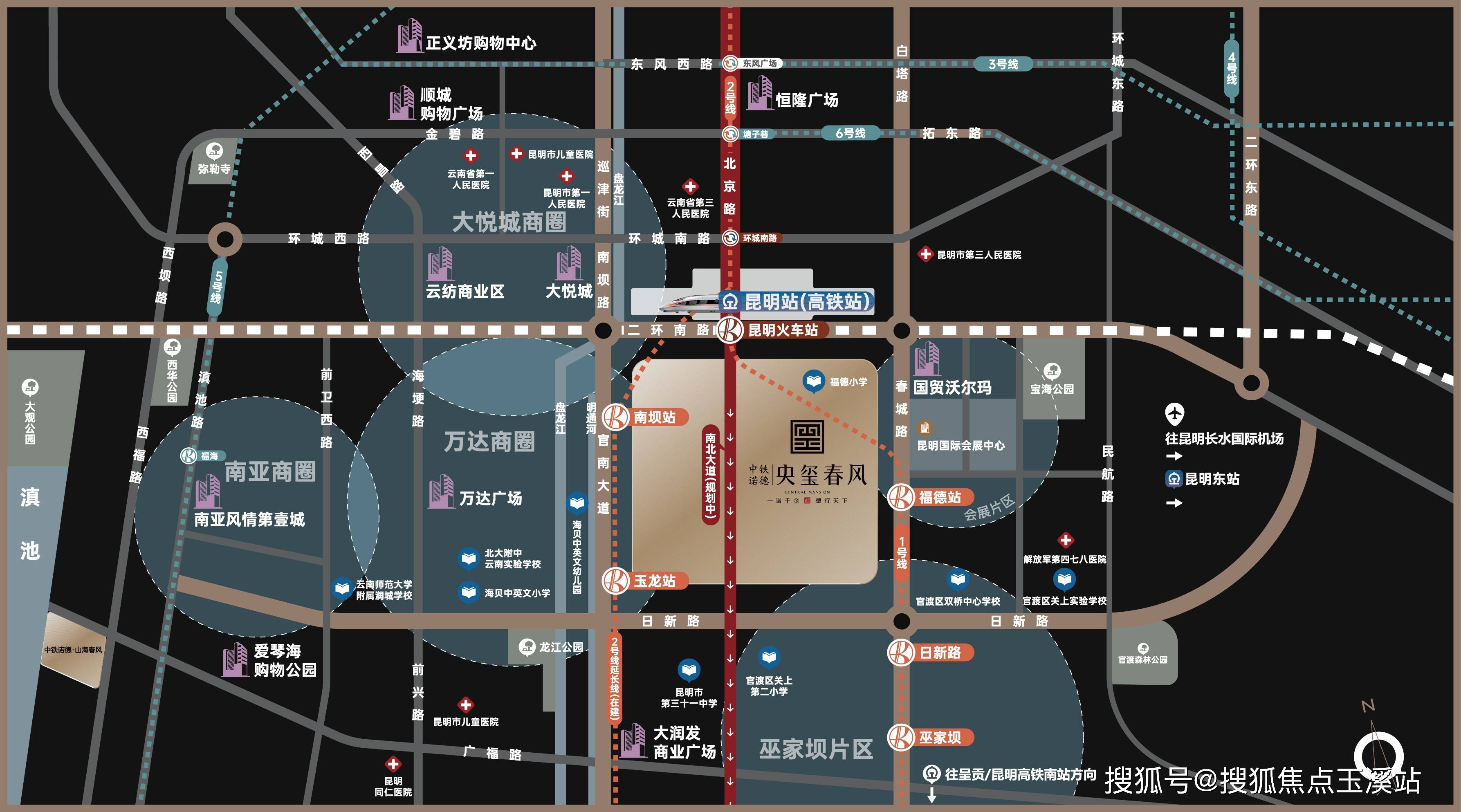 项目范围内覆盖2线号线:福德站、昆明火车站;2号线(在建):南坝站、玉龙站