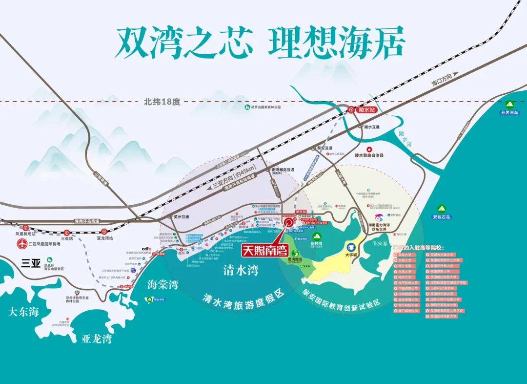 海南清水湾4A旅游度假区与国际旅游岛先行试验区中轴之心,紧靠自贸港11大重点产业园区的陵水黎安国际教育创新示范区,汇聚旅游业、高等教育产业等发展优势,未来发展潜力巨大!