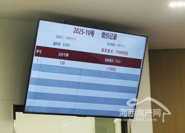 2025年6月30日,经过1轮竞价,136号竞买人福州新榕筑业工程有限公司以底价17.08亿竞得福州宗地2025-10号,楼面地价21881.89元/㎡。