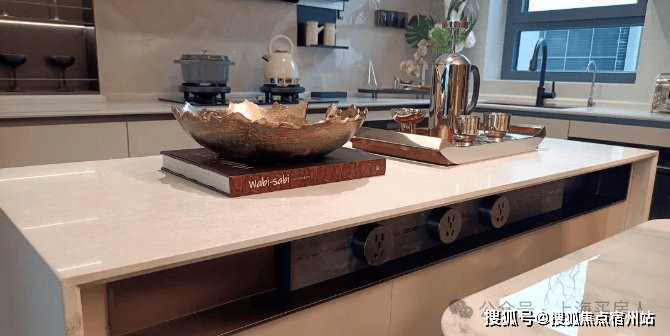 有收纳柜体的岛台空间,轨道式插座同样是交付标准,厨房台面是和内环某10万+项目同款材料: