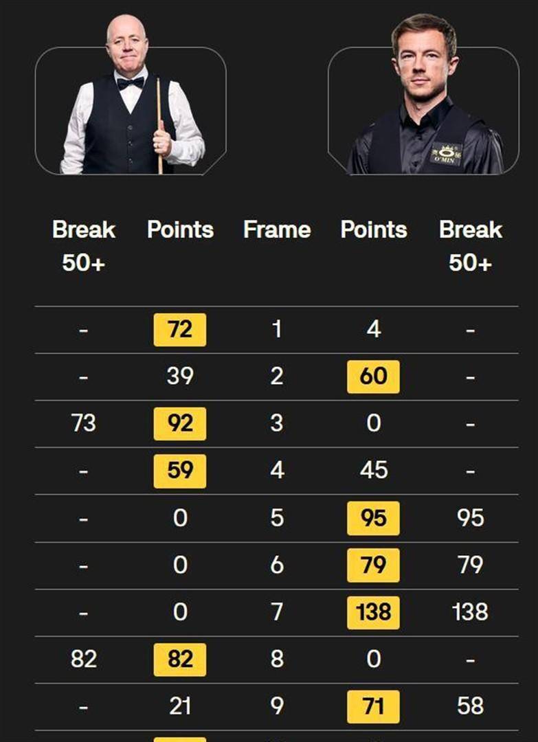 整场比赛像坐过山车。 霍金斯开局顺利,凭借单杆72分和66分,一度取得4比1的领先。 所有人都觉得,经验将轻松碾压青春。 但吴宜泽不答应。 这个22岁、世界排名第十的小伙子,在1比4的绝境下突然爆发。 单杆83分、74分,紧接着是一杆干净利落的122分破百。 他连扳三局,将比分追成4比4平。